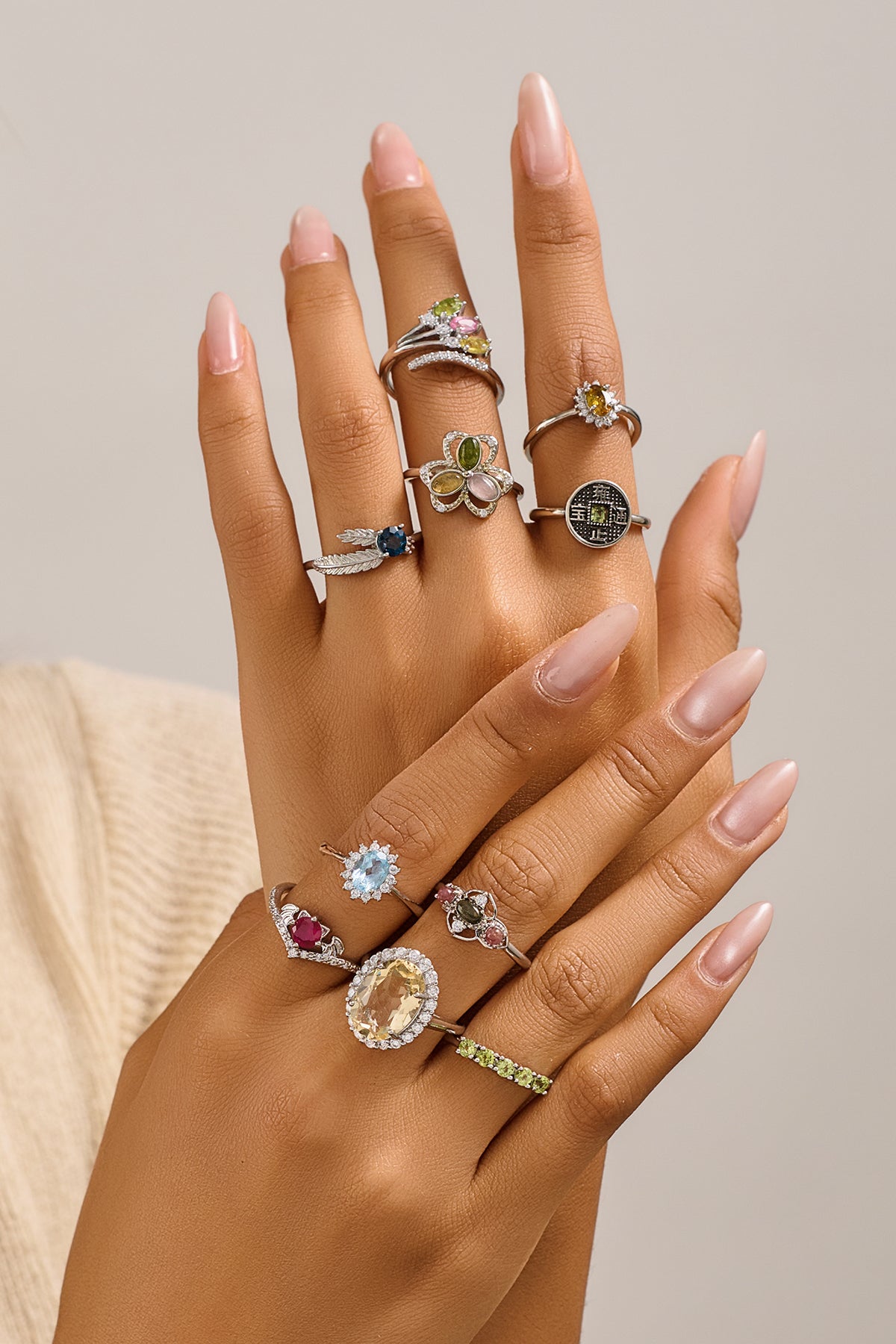 A special wooden box containing 100 unique, individually crafted adjustable rings, each decorated with beautiful natural stones and made from silver-plated brass.