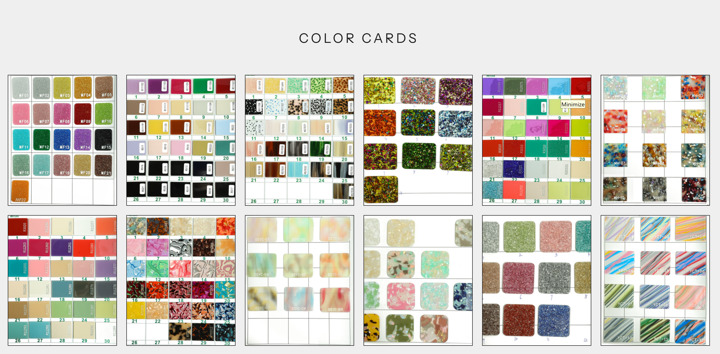 First, click the "COLOR CARD" button below and provide us with the color code along with the color card number of your desired acetate/acrylic color.