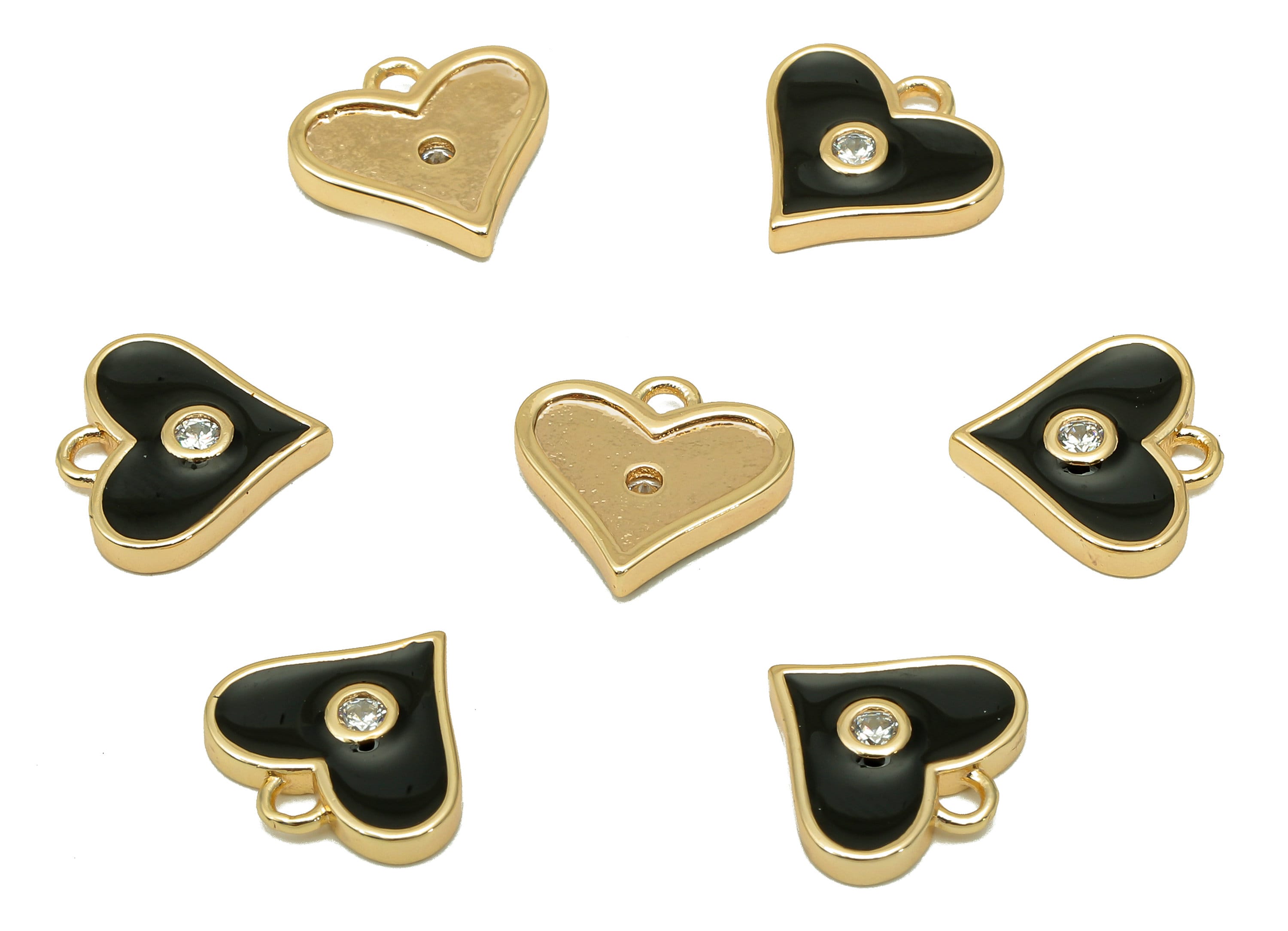 Brass Black Heart Earring Charm - Zircon Dots Enamel Heart Earring - Pendant With Loop - 18K Real Gold Plating