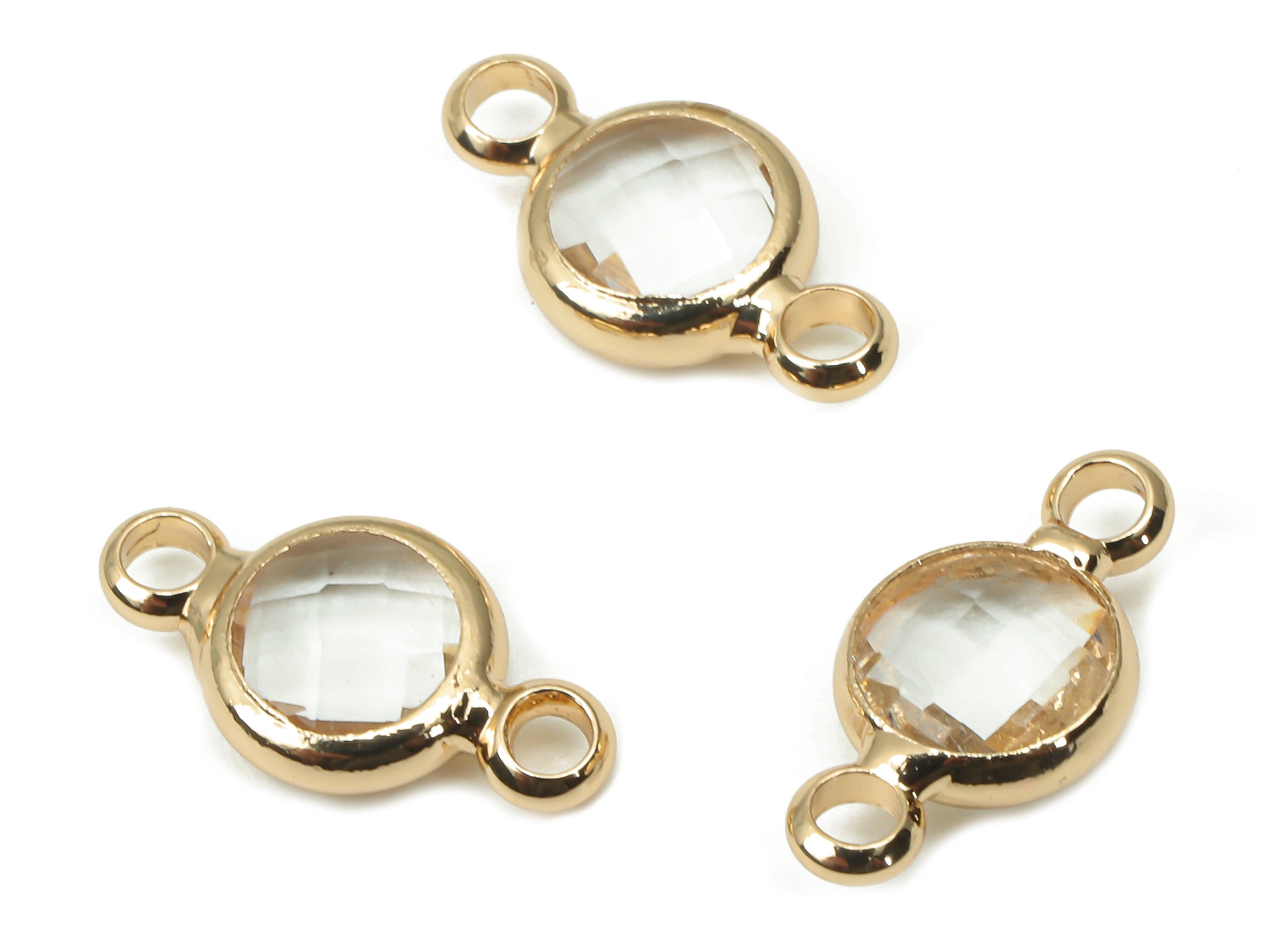 Brass Clear Glass Earring Connector - Mini Round Frame Bracelet Charm - Gold Tone Plating - Faceted Transparent Glass