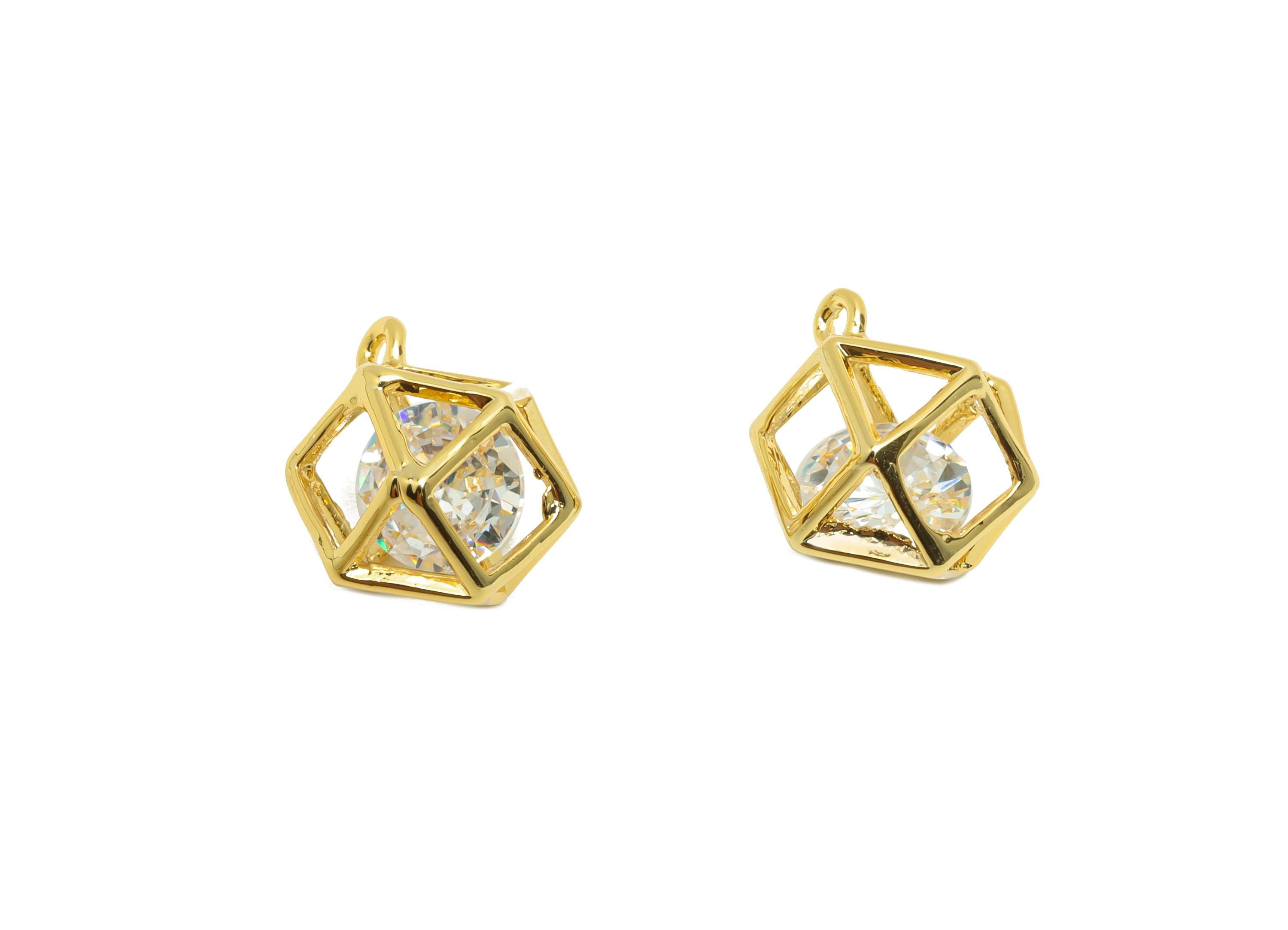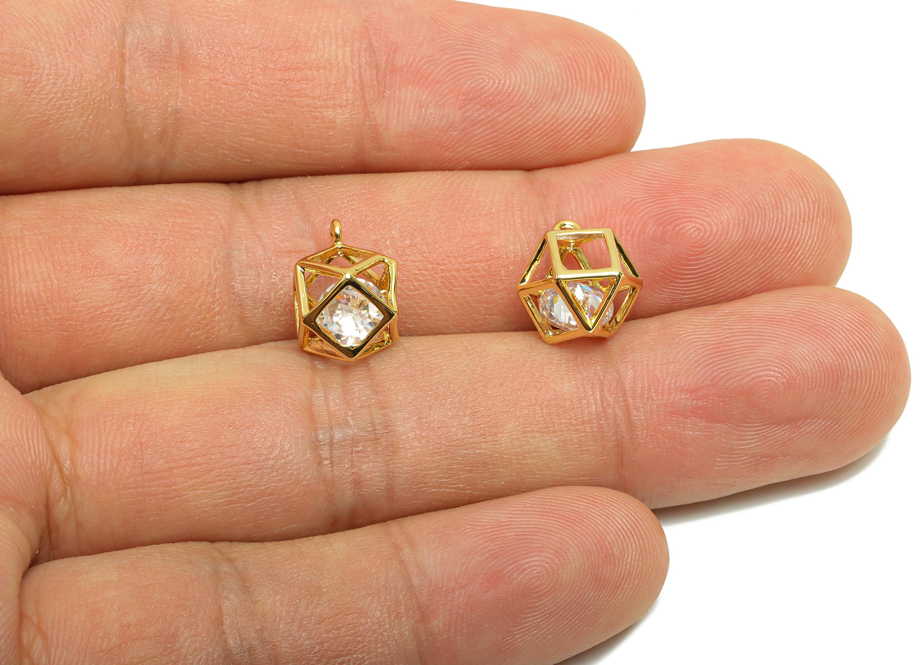Brass Diamond Earring Charm - Gold Hollow Ball Charm for Bracelet - Zircon Pendant with Loop - 18K Real Gold Plating