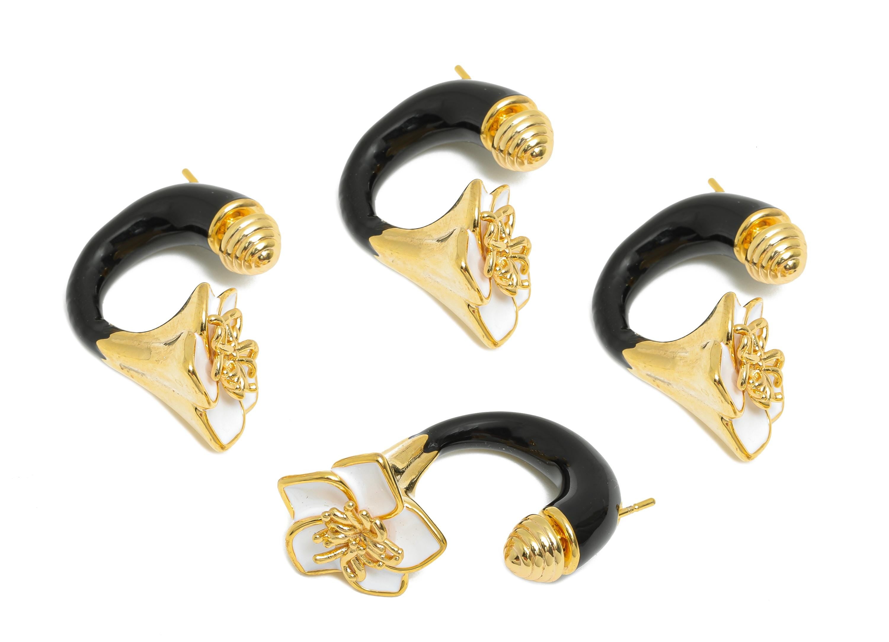 Brass Enamel Flower Earring Set - Black Enamel Flower Earring Stud - Chunky Floral Hoop Post - 18K Real Gold Plated - 30x19x15mm - RGP10968B