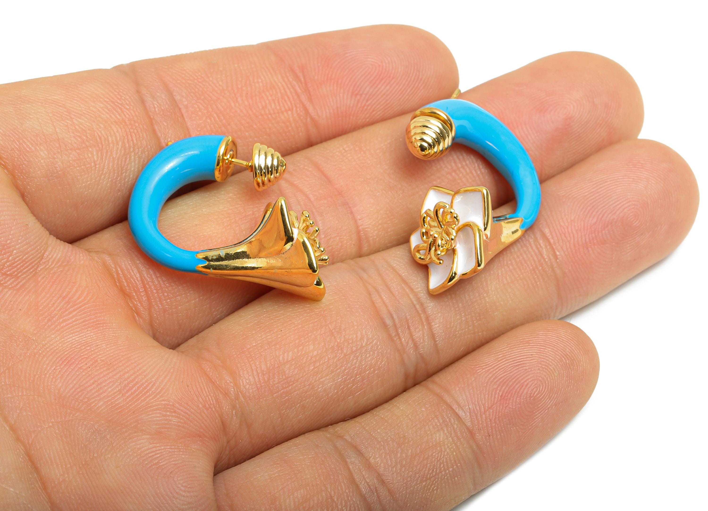 Brass Enamel Flower Earrings Set - Enamel Flower Earring Stud - Chunky Floral Hoop Jewelry - 18K Real Gold Plated
