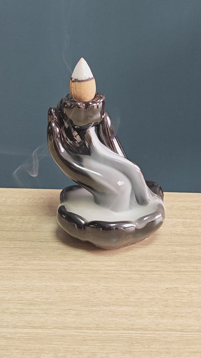 Ceramic Reflux Incense Burner - Decorative Incense Burner Biblo - Glazed Ceramic Hand Holding Lotus Smooth Glossy Burner 10.5cm