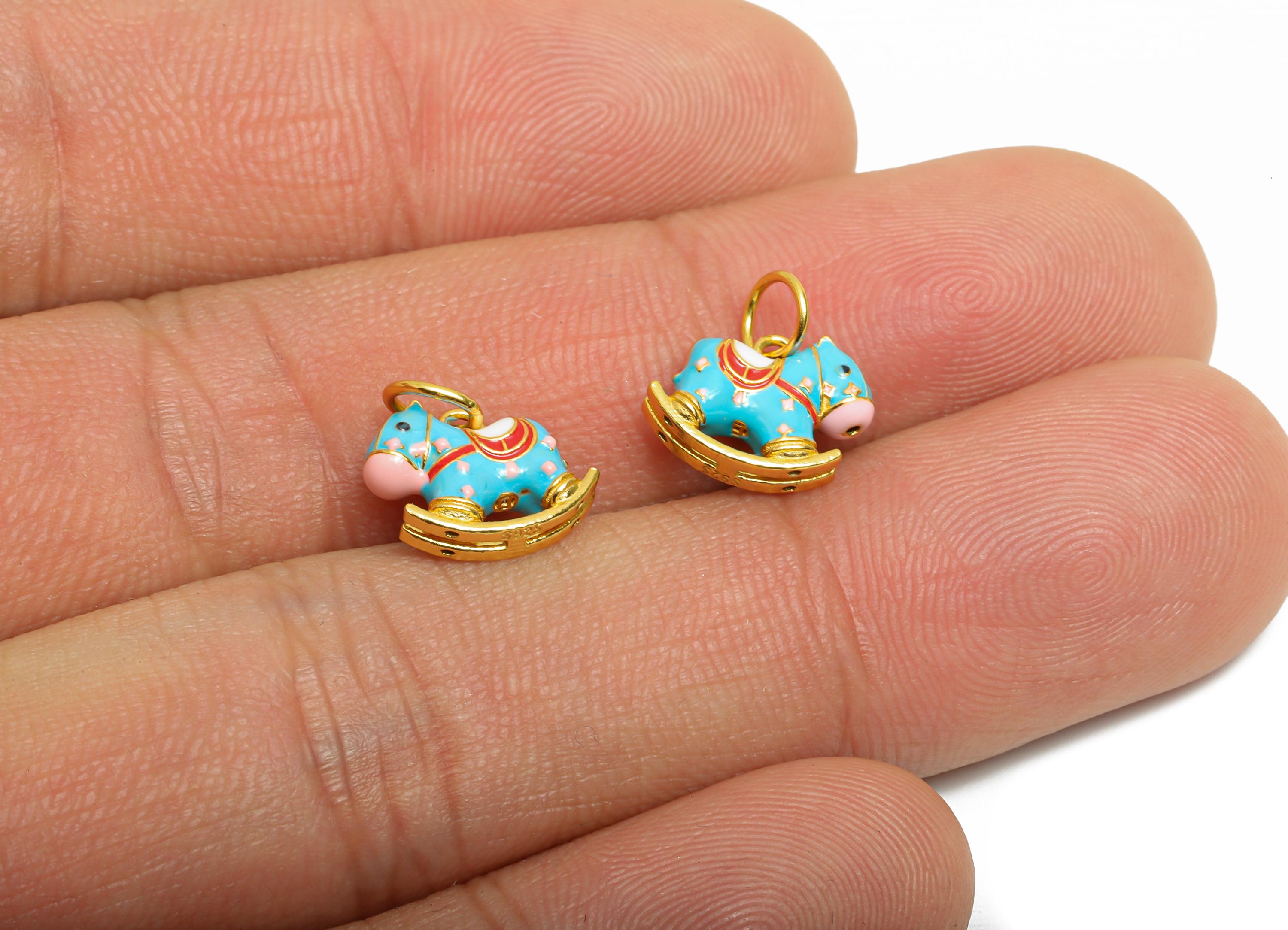 Enamel Rocking Horse Charm - Whimsical Animal Bracelet Charm for Kids - 925 Sterling Silver - KC Gold Tone Plated