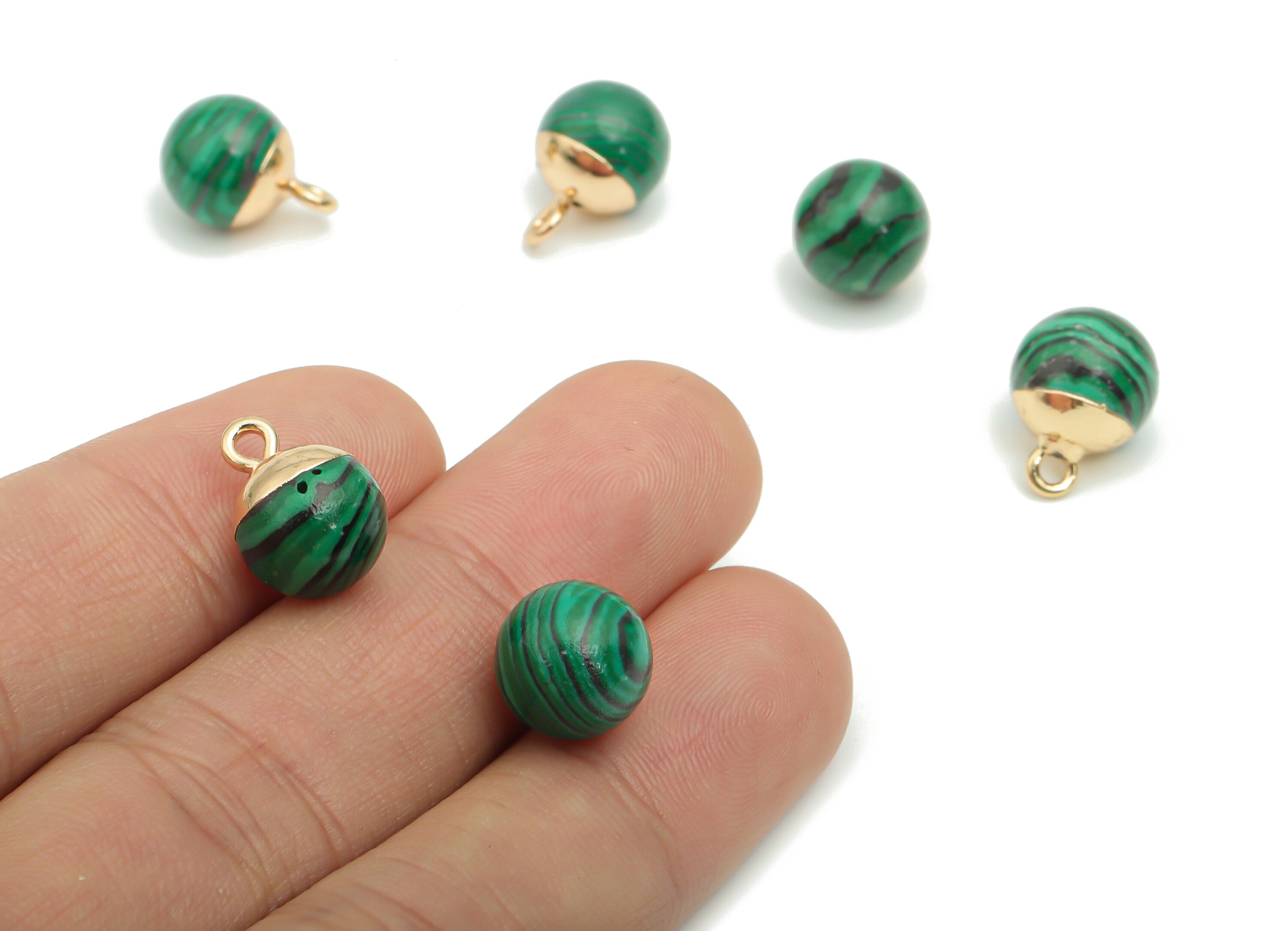 Malachite Ball Beads Earring Charms - Brass Beads Pendant - Iron Loop - Natural Stone - Gold Tone Plated Brass – 14.58x10.8x10.8mm – NS1578E