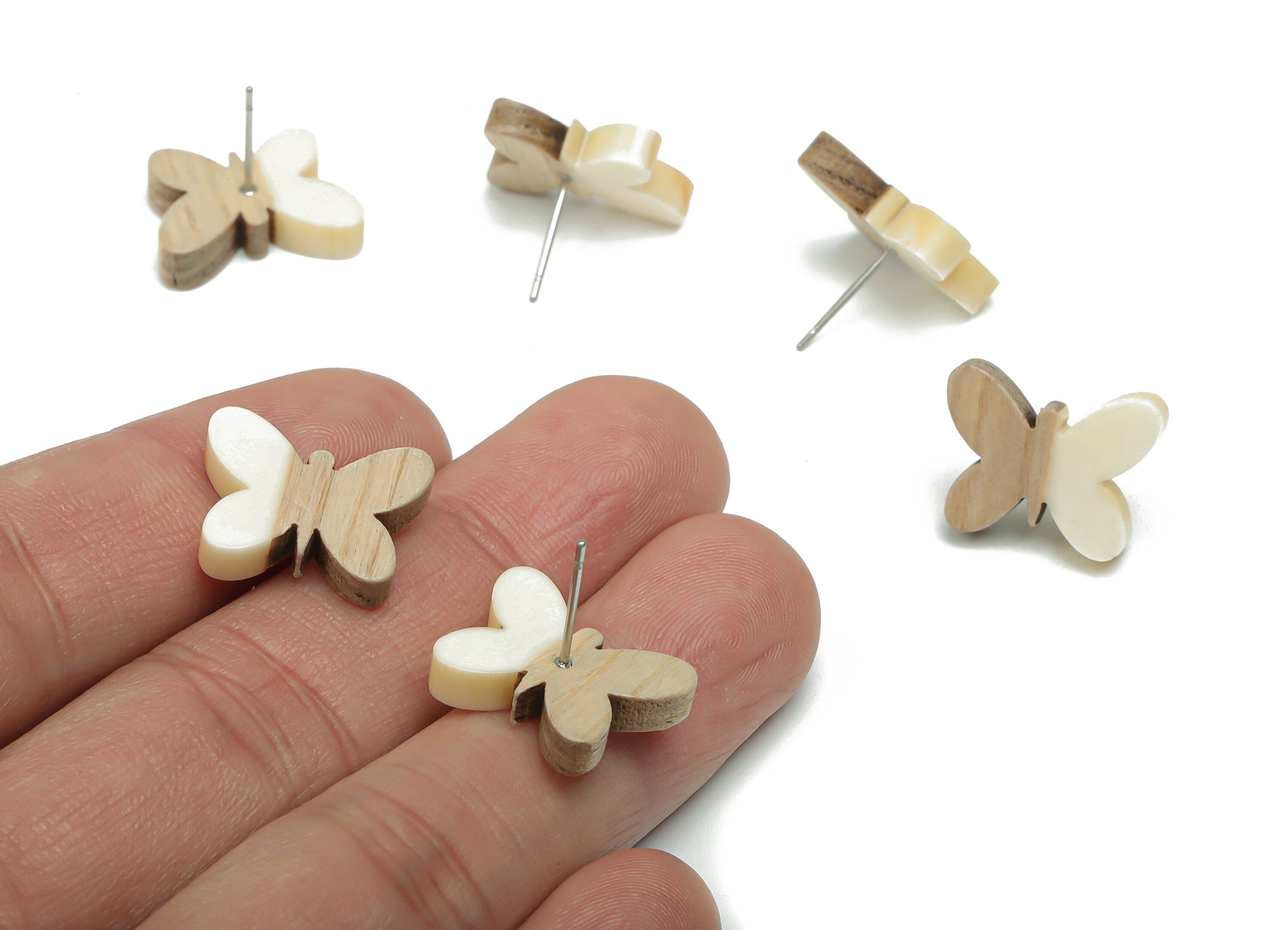 Natural Wood Butterfly Earring Stud - Resin Butterfly Post - 316 Surgical Stainless Steel - Jewelry Supplies - 17.87x13.77x3.78mm - BB1165B