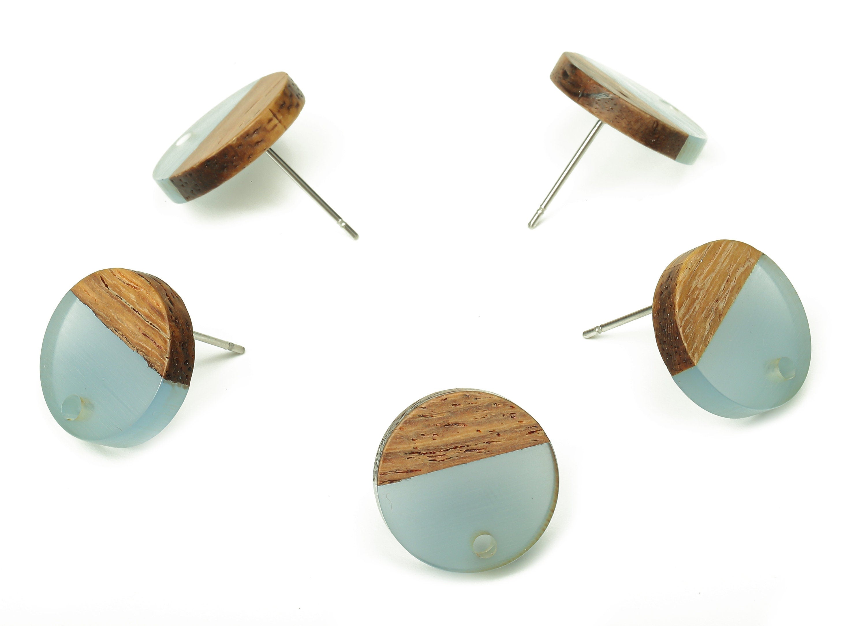 Natural Wooden Round Earring Stud - Walnut Wood Light Blue Resin Circle Earring Post - 316 Stainless Steel Stud