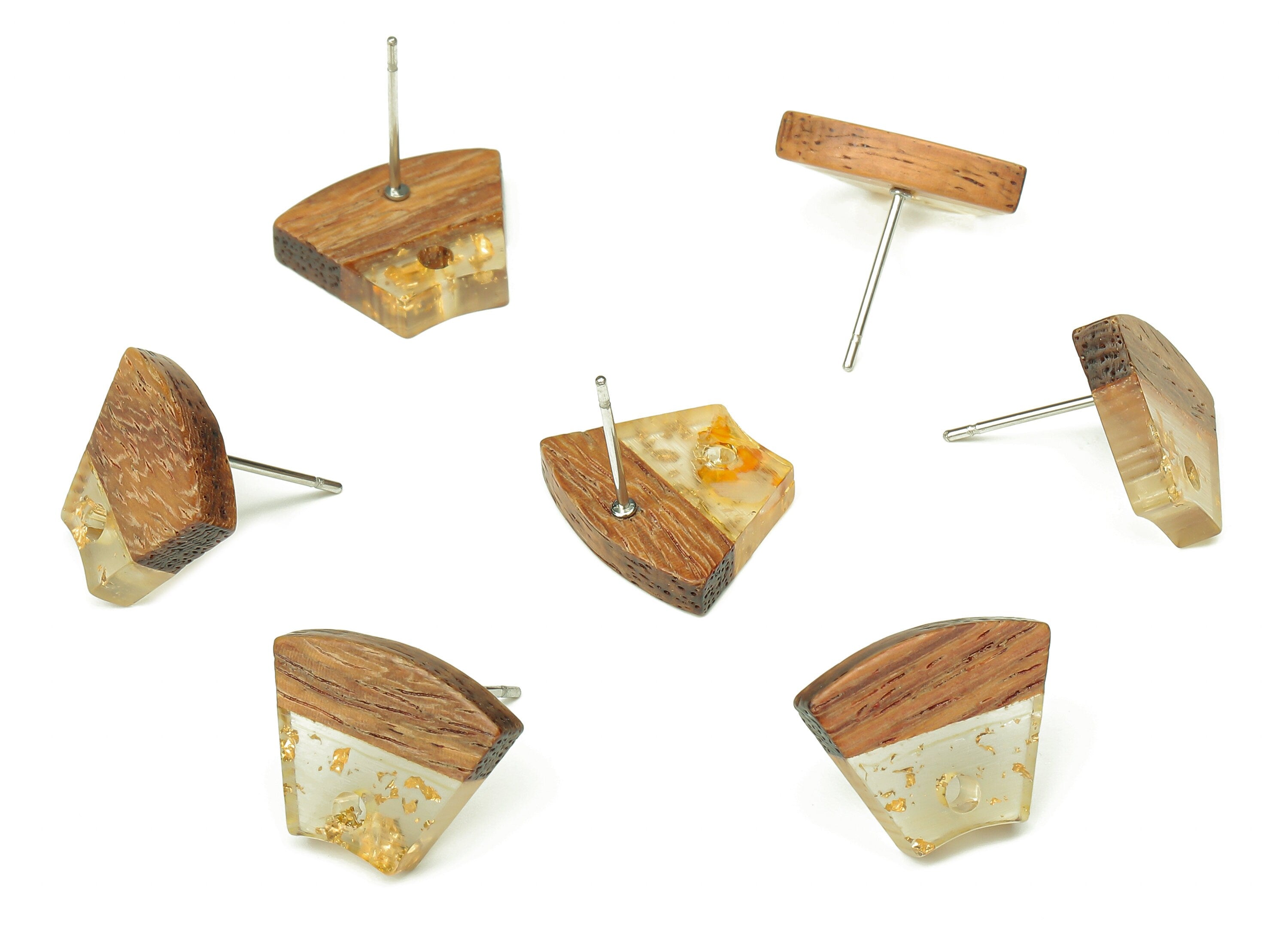 Natural Wooden Trapezoid Earring Stud - Walnut Wood Gold Foil Clear Resin Fan Earring Post - 316 Stainless Steel Stud