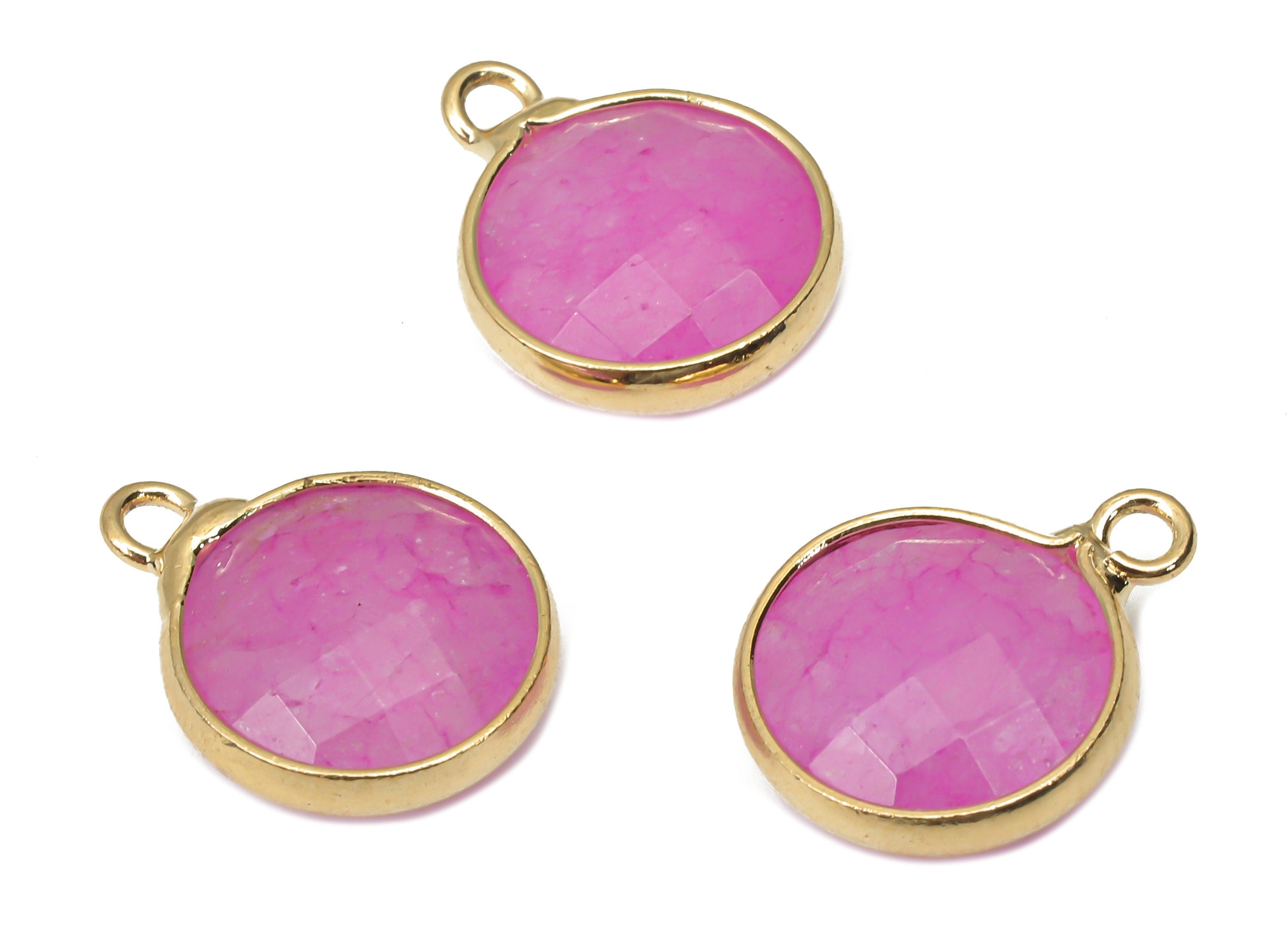 Pink Agate Gemstone Round Earring Charms - Brass Circle Pendant - Faceted Natural Stone - Gold Tone Plated Brass – 14.4x11.2x4.3mm – NS1850D