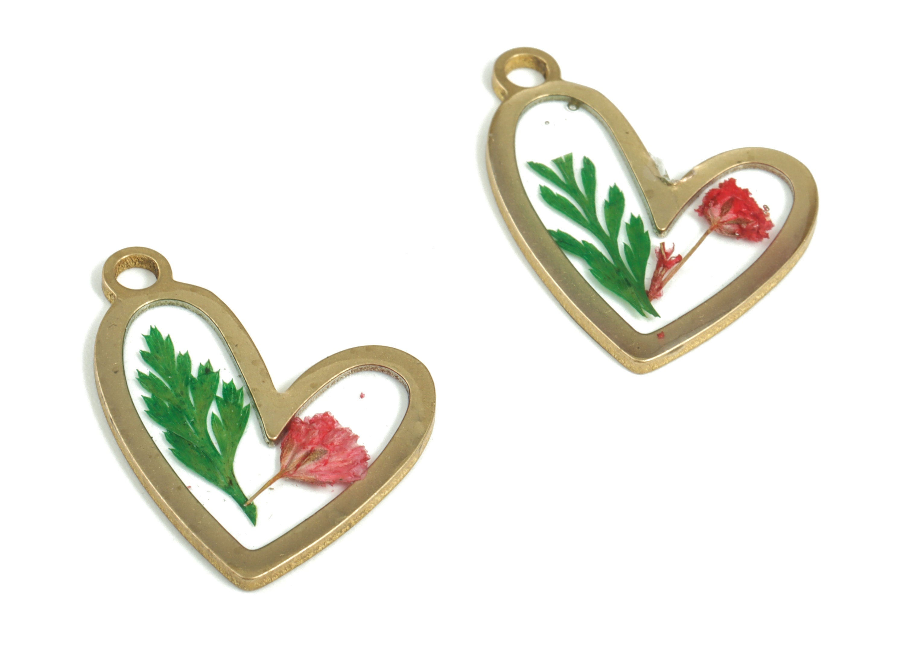 Resin Heart Earring Charms - Resin Real Flower Pendant - Raw Brass Charm - Red Flower Charm - Jewelry Supplies - 24.92x20.57x1.91mm - RC1149