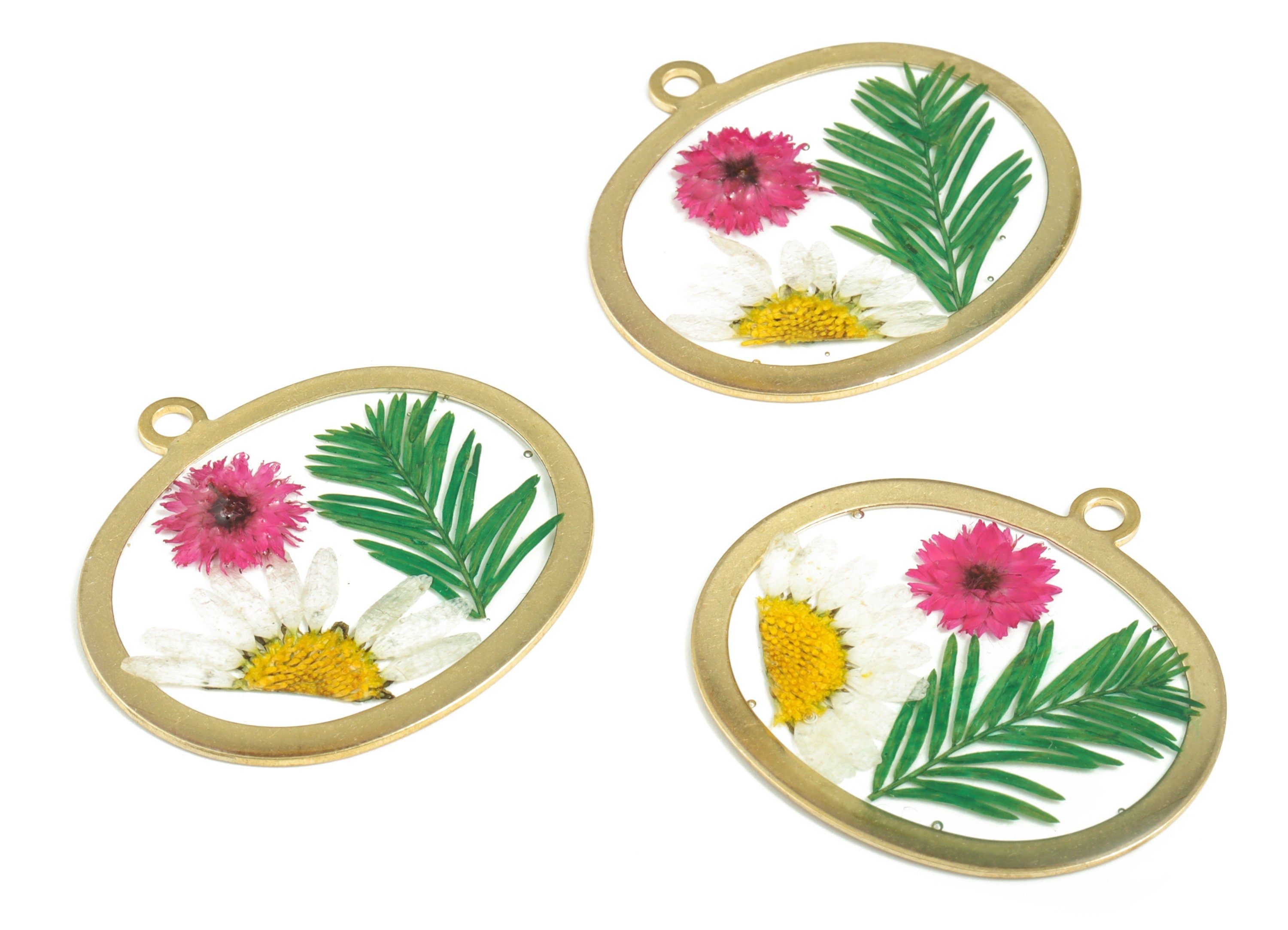 Resin Oval Earring Charms - Resin Real Flower Pendant - Raw Brass - Jewelry Making Supplies - 37.55x35.05x1.91mm - RC1145