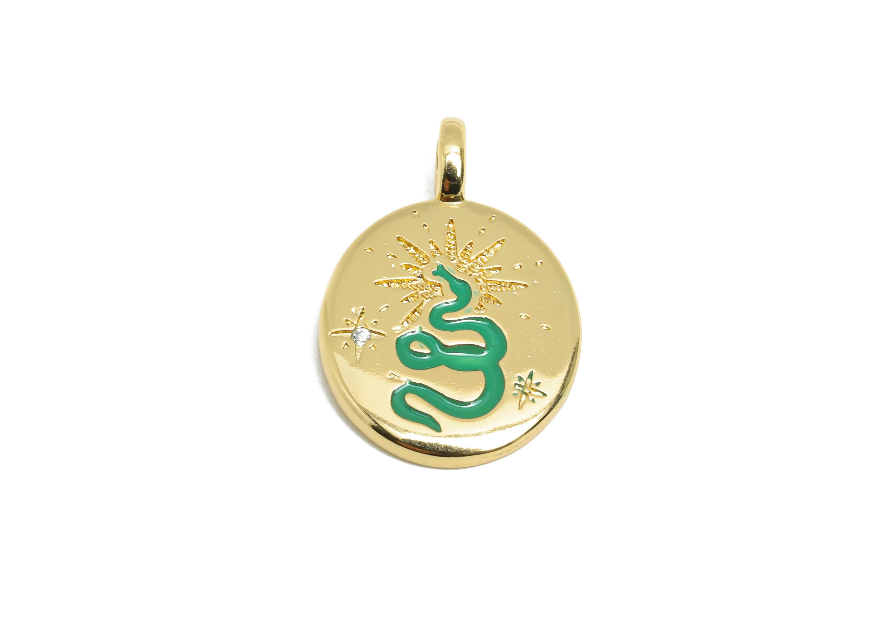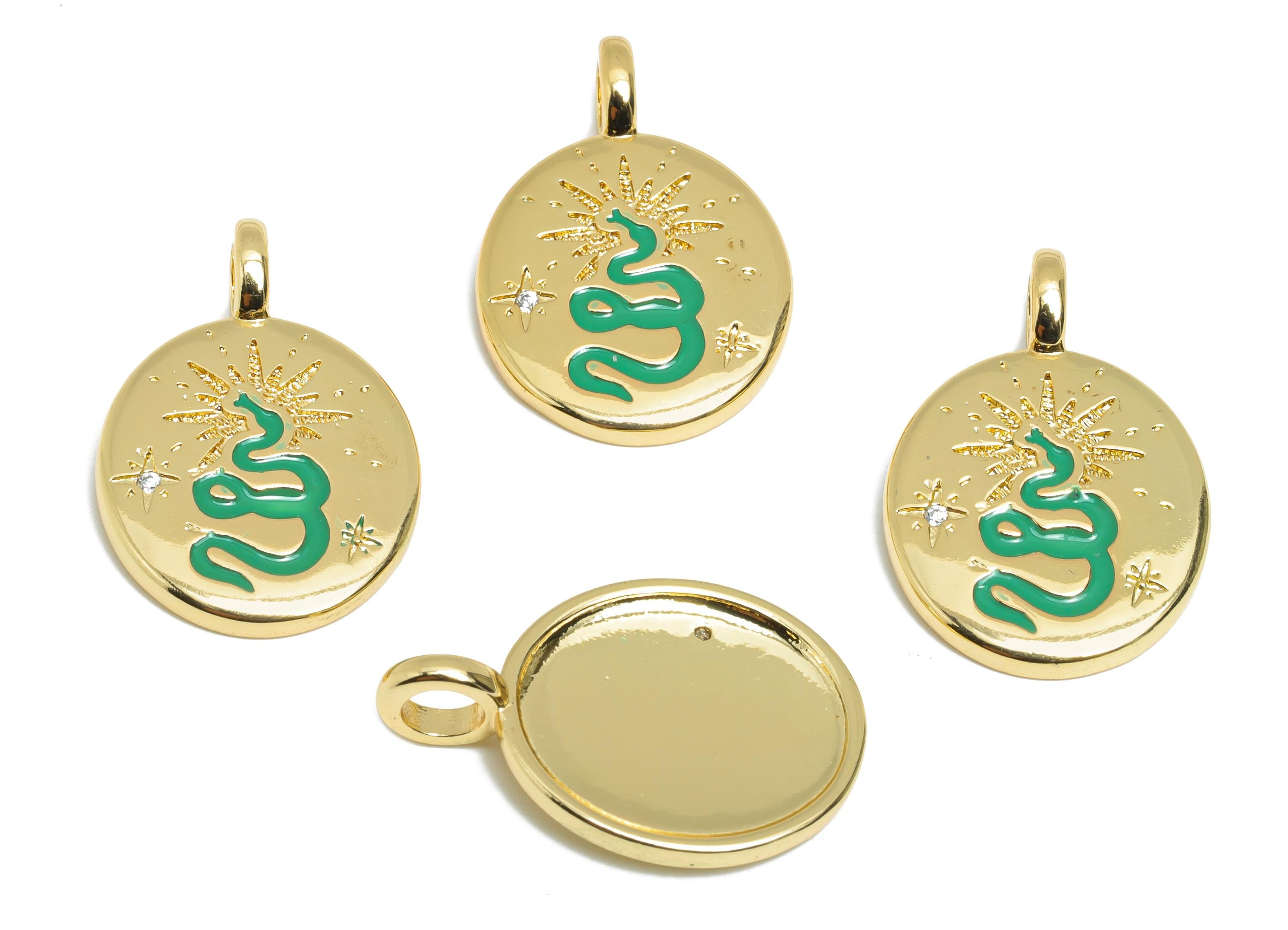 Snake Enamel Oval Pendant - Brass Symbol of Protection Jewelry - Zircon Vintage Snake Pendant - 18K Real Gold Plating