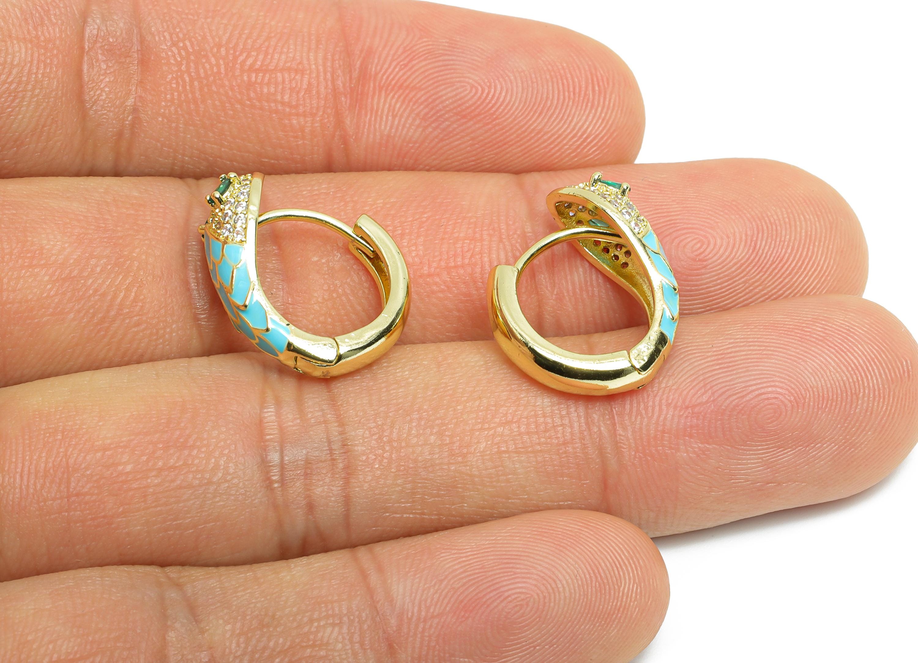 Snake Hoop Earring - Brass Blue Enamel Huggie Hoop - Cubic Zircon Dainty Animal Hoop Earrings - 18K Real Gold Plating