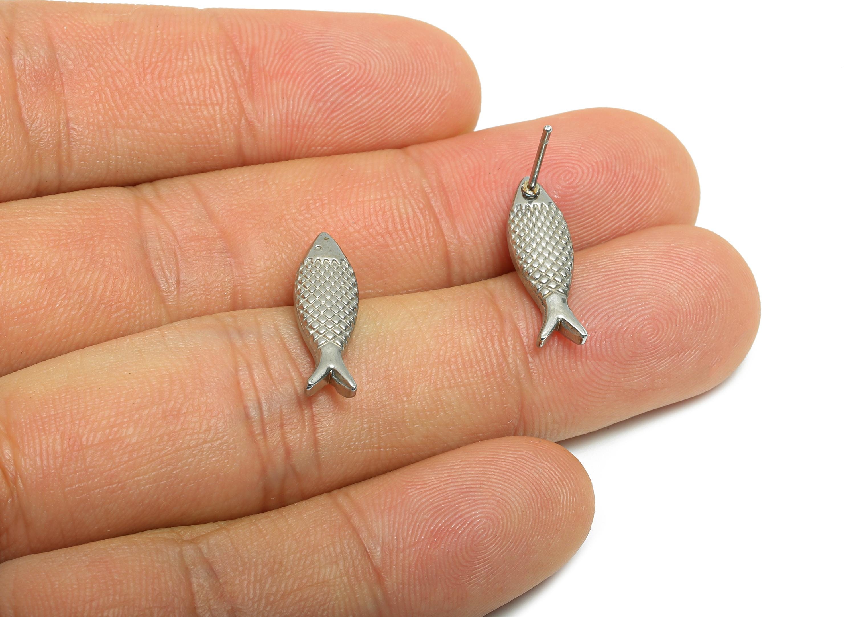 Steel Fish Stud Earring - Steel Textured Fish Earring - Steel Marine Life Earring Post - Stainless Steel Post