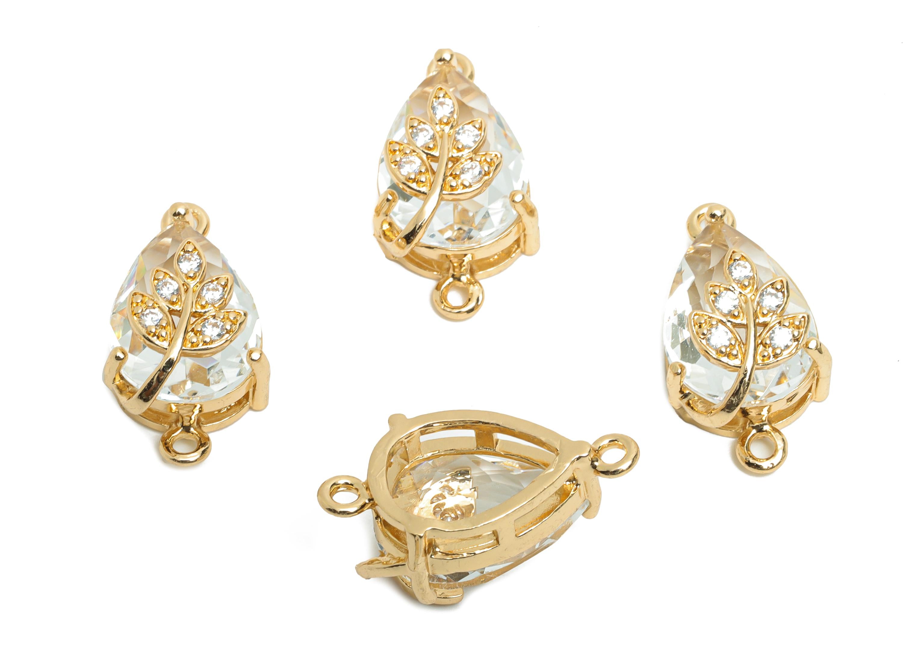 Teardrop Crystal Connector - Dainty Faceted Glass with Leaf Charm - Artisan Crystal Jewelry - KC Gold Plated