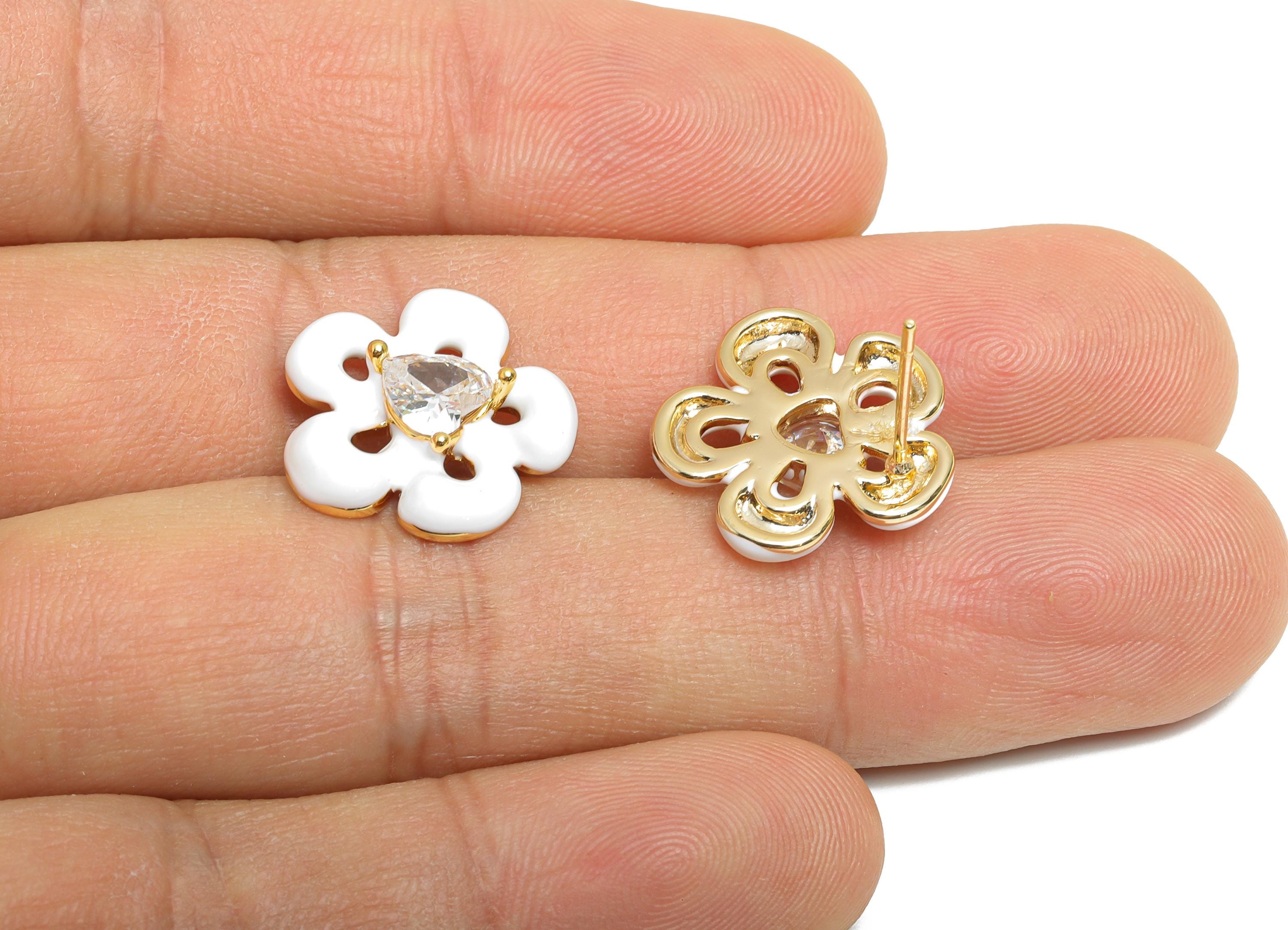 White Enamel Flower Earring - Brass Cubic Zircon Colorful Earring - Bold Spring Summer Charm - 18K Real Gold Plating - 17x16x4mm -RGP10377B